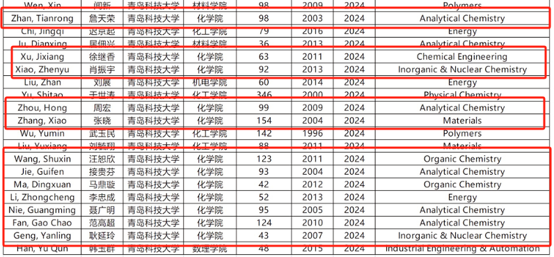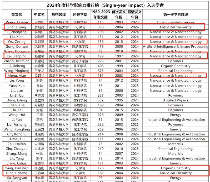 近日,美国斯坦福大学(Stanford University)和国际权威学术出版社爱思唯尔(Elsevier)共同发布了2024年度全球前2%顶尖科学家榜单(World's Top 2% Scientists 2024)。榜单分为“终身科学影响力排行榜(1960-2024)(Career-long Impact)”——关注整个学术生涯迄今的影响力和“2024年度科学影响力排行榜(Single-year Impact)”——聚焦本年度的学术成就。化学院3位学者入选全球前2%顶尖科学家——“终身科学影响力排行榜”,18位学者入选全球前2%顶尖科学家——“年度科学影响力排行榜”。