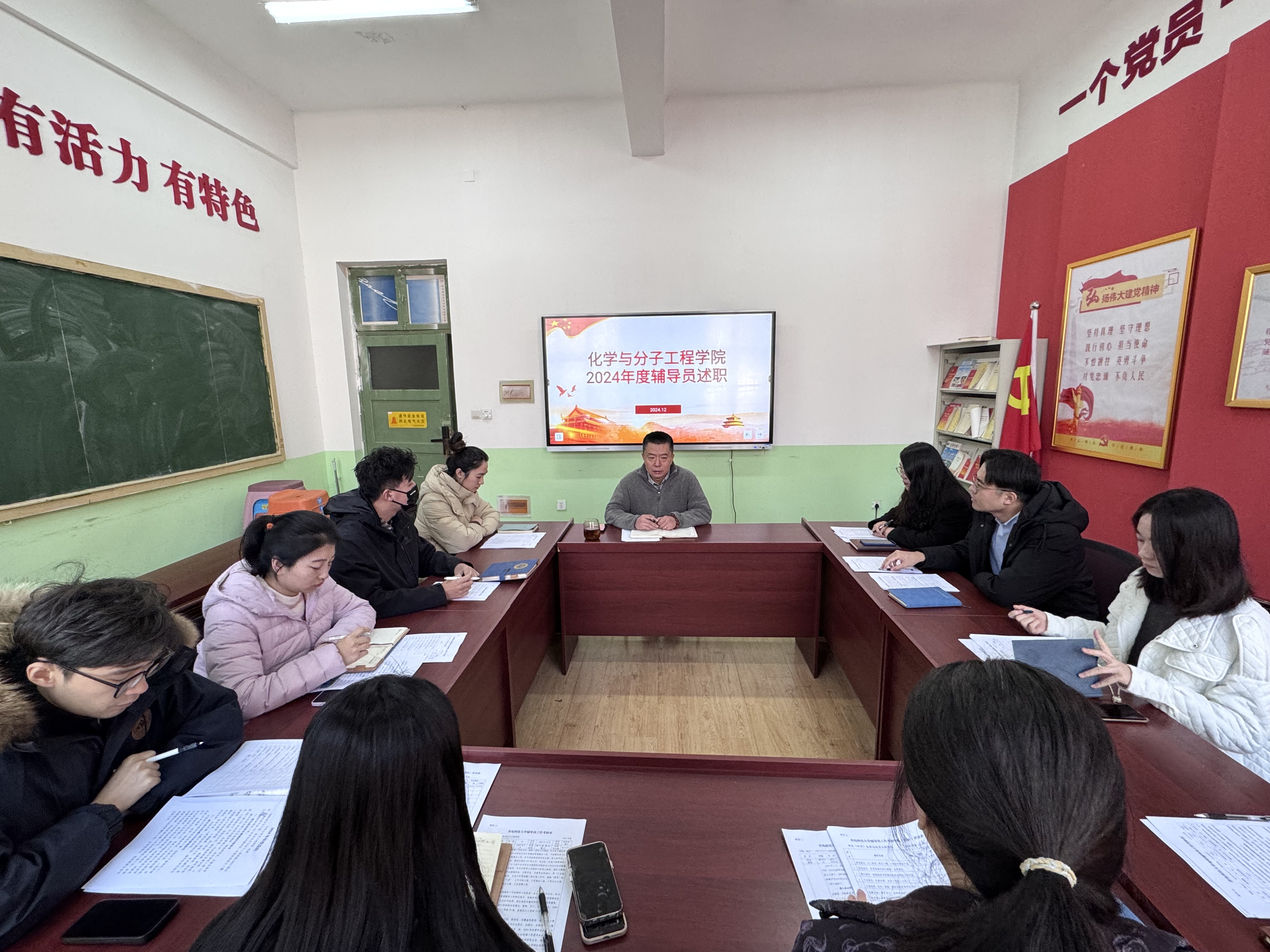 为进一步提高学院辅导员的思想政治素养和教育管理能力,建设一支“政治强、业务精、纪律严、作风正”的辅导员队伍,充分发挥辅导员考核的激励导向作用,按照学校考核要求,12月17日上午,化学院于党建活动室组织2024年度辅导员述职评议会。学院党政领导、学工办全体辅导员参加会议。会议由化学院党委副书记兼副院长刘尧主持。