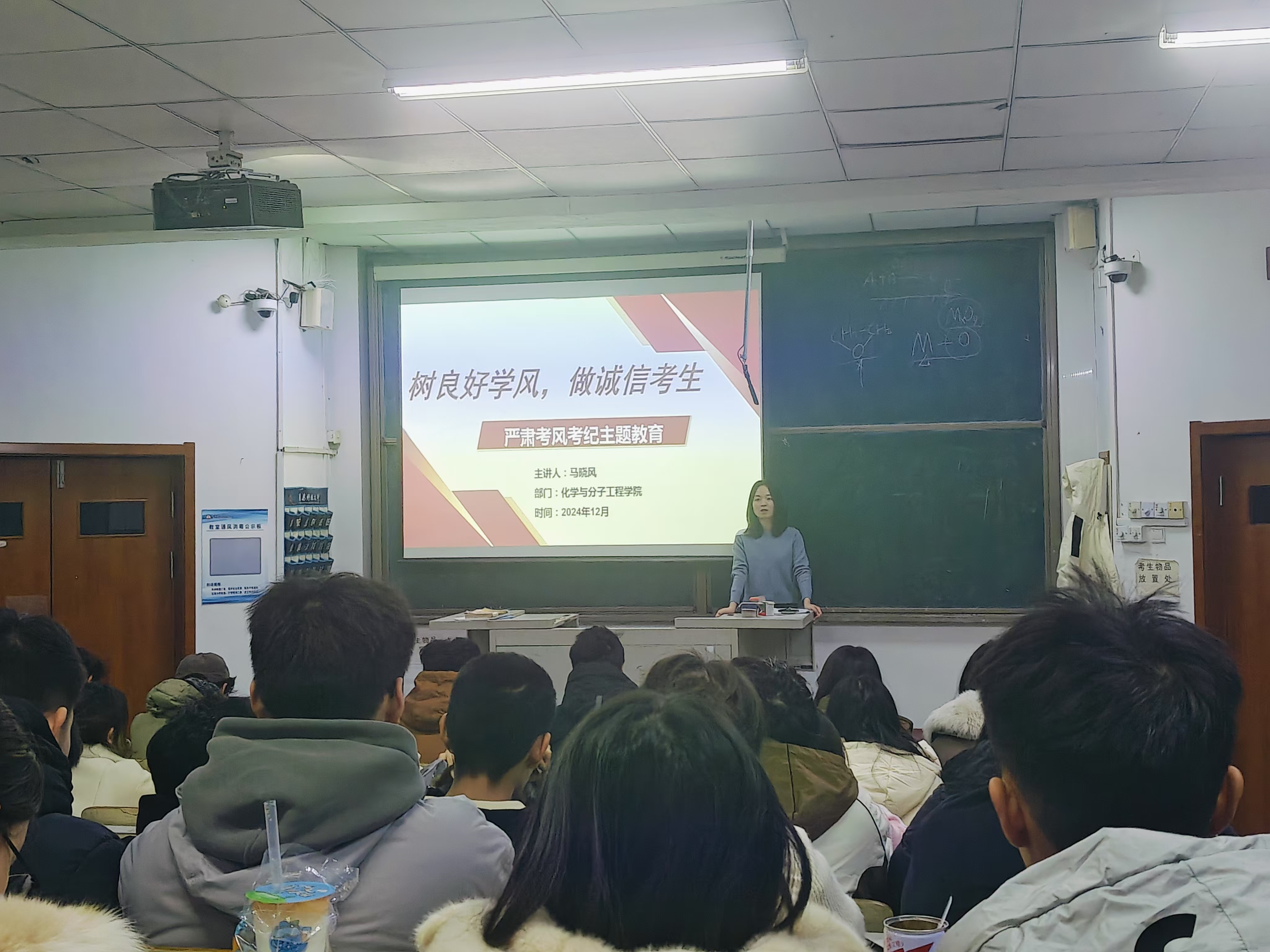 2024年12月10日,为进一步加强学风建设,倡导诚信考试,永利y23455于第一教学楼102教室举办了“树良好学风,做诚信考生”严肃考风考纪主题教育大会。大会由马晓风老师主讲,22级全体同学参加。