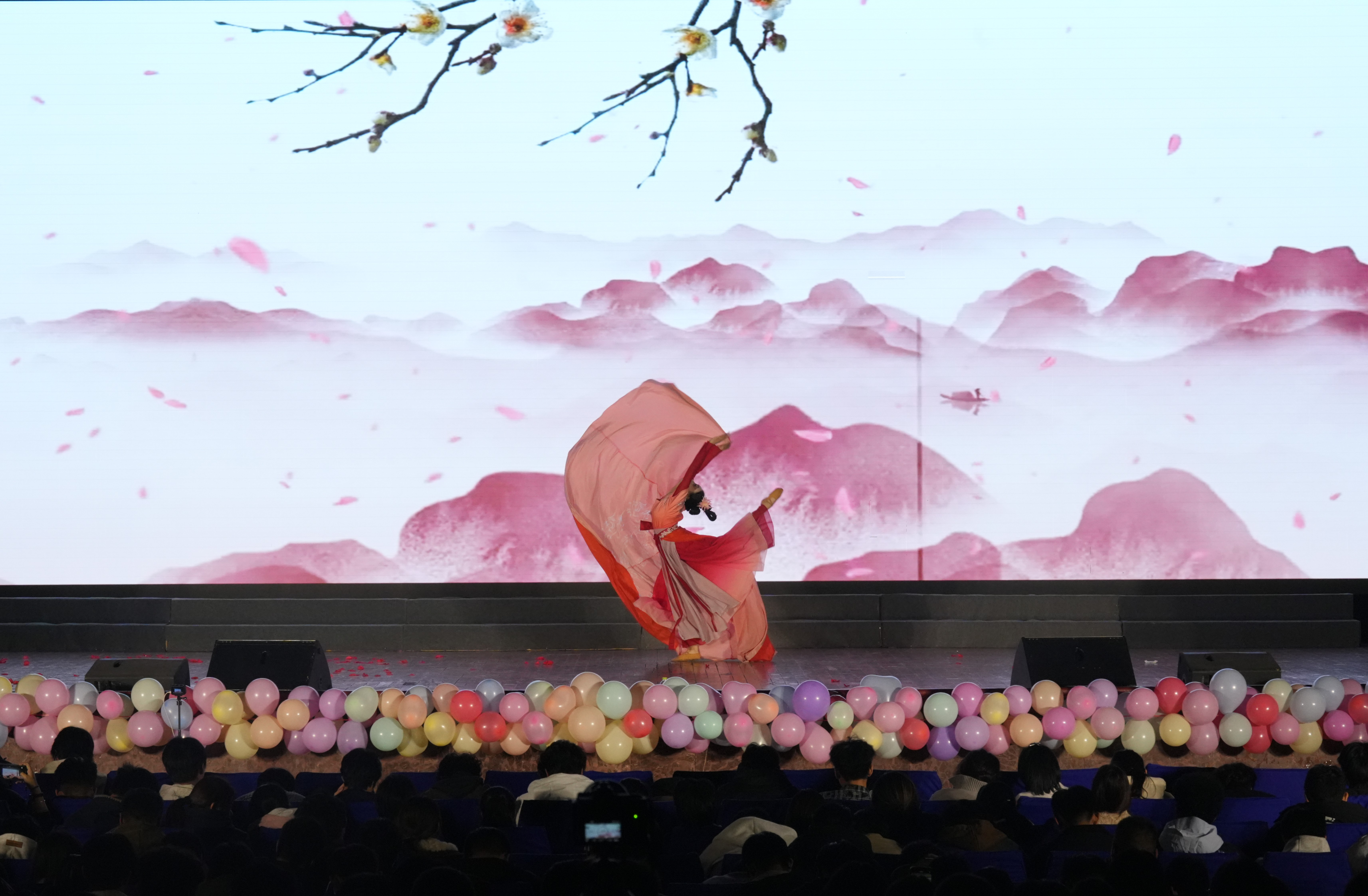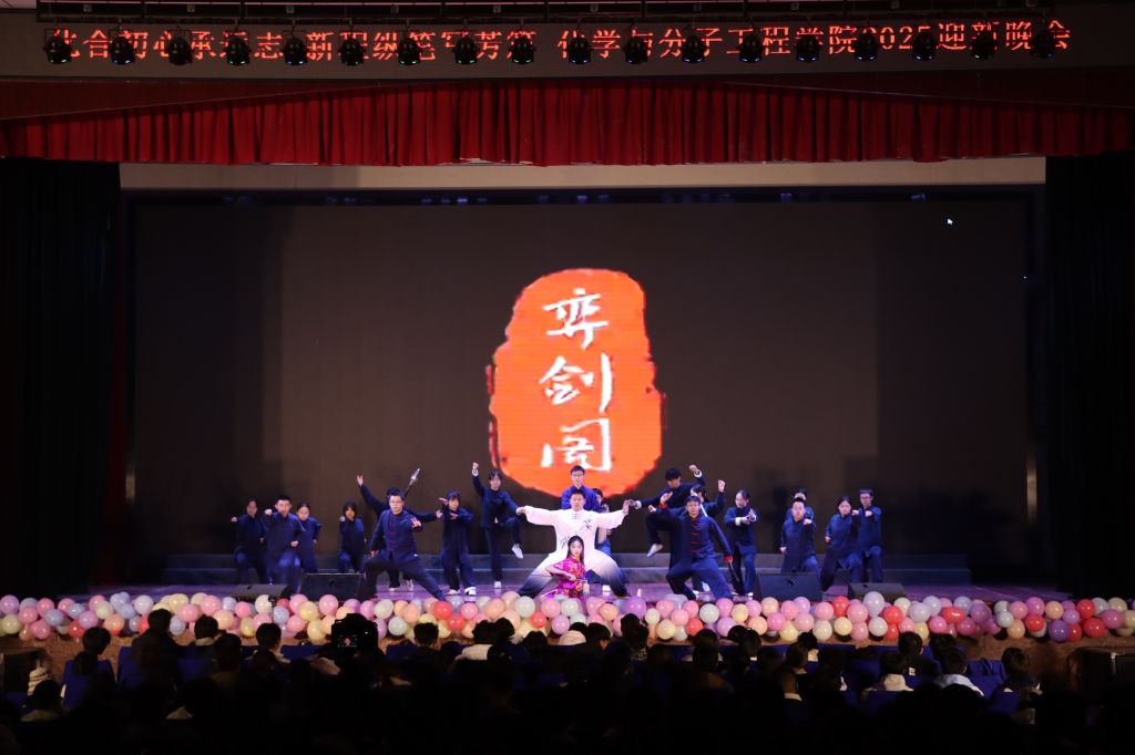 《剑心武韵》武术表演刚柔并济、气势如虹,展现中华武魂;独舞《巫山梦·红梅妆》以古典意象融合现代审美,舞姿婉转、意境悠远,尽显中华传统文化之美;化学院合唱团深情献唱《英雄赞歌》,歌声嘹亮、情感真挚,致敬民族脊梁;最后,化学院第十五届学生会全体成员惊喜亮相,以“彩蛋”形式集体登台,用歌声和舞步传递快乐的笑容,将晚会氛围推向高潮。