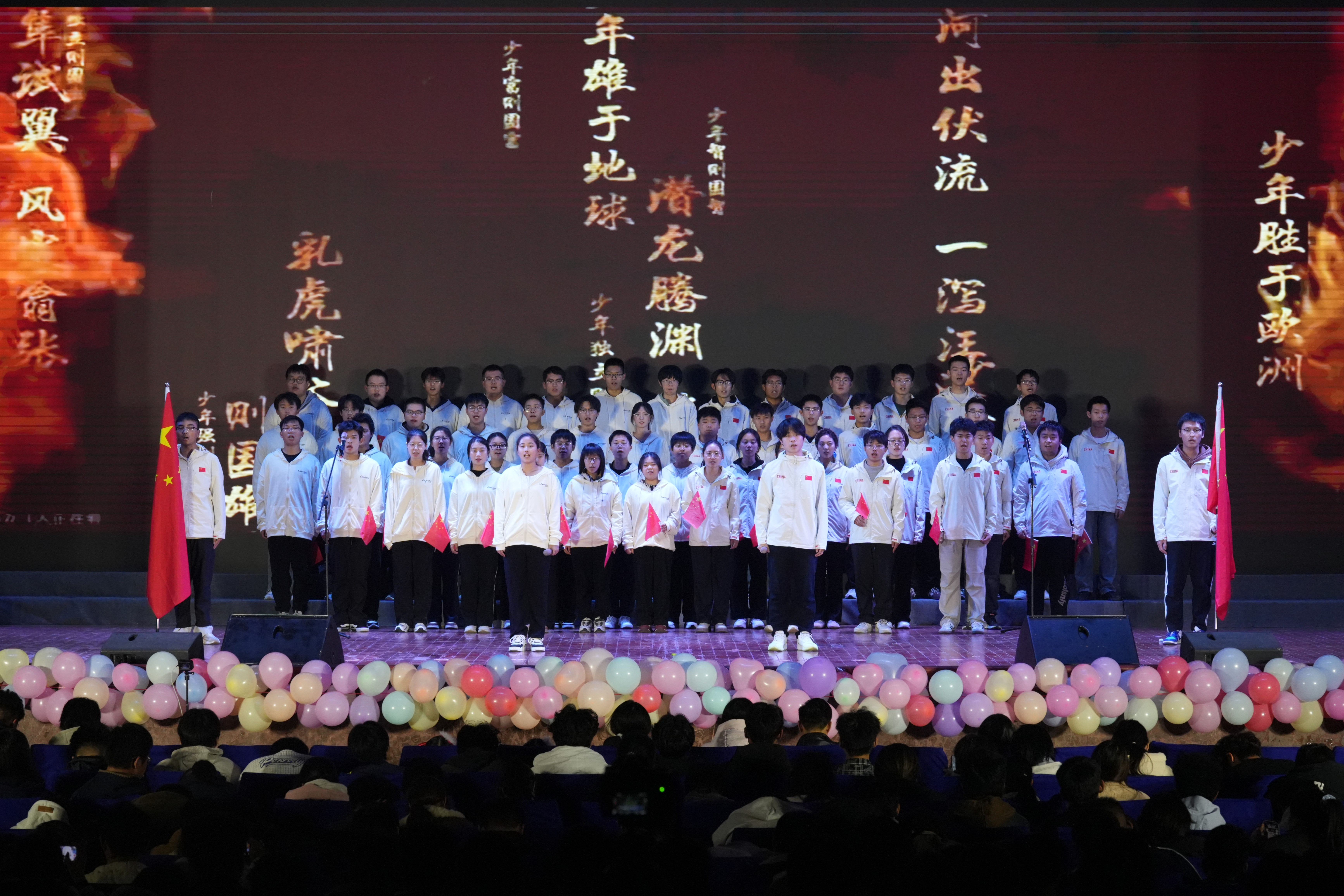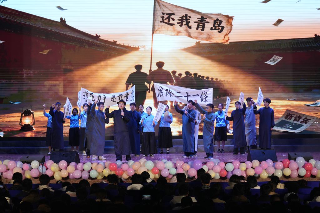 中国舞《秀色》衣袂翩跹、意境悠远,尽显东方美学韵味;能化251班与化学253班联袂献上铿锵激昂的朗诵《少年中国说》,字字铿锵、掷地有声,抒发了新时代青年“强国有我”的豪迈誓言;话剧《破晓的呐喊》通过沉浸式演绎巴黎外交失败、青年者奋起反抗的历史场景,让在场师生深刻感受到百年前青年学子“为中华之崛起而读书”的赤诚初心。