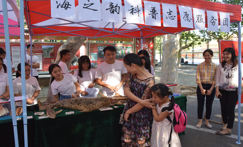 化学院长期重视志愿服务引领,学院的海之韵科普志愿服务团在迎新现场布置了科普展,以海洋动物标本为契机,介绍海洋环境与人类生存的密切关系,吸引了大量家长和学生驻足观看。