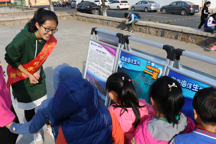 为丰富大学生的海洋科普知识,让大学生更加了解海洋,热爱海洋,保护海洋,同时让学生能近距离接触更多的海洋生物,化学院海之韵科普志愿服务团于10月31日,在四方校区小五四广场举行了第五届海洋科普校园行活动。青岛水族馆金牌讲解员李杰、化学院分团委老师刘夕升出席了活动开幕式并分别致辞。