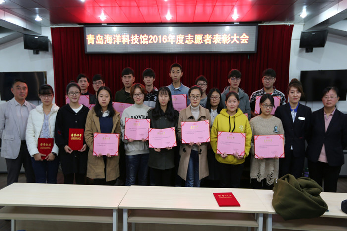 11月4日,青岛海洋科技馆在科技馆2号楼会议室举行2016年度科普志愿者表彰大会,对去年表现优异的志愿者进行表彰。海之韵王莉鑫等同学荣获优秀科普志愿者一等奖,董秀月等同学荣获优秀科普志愿者二等奖,徐敏等同学喜获优秀科普志愿者纪念奖。