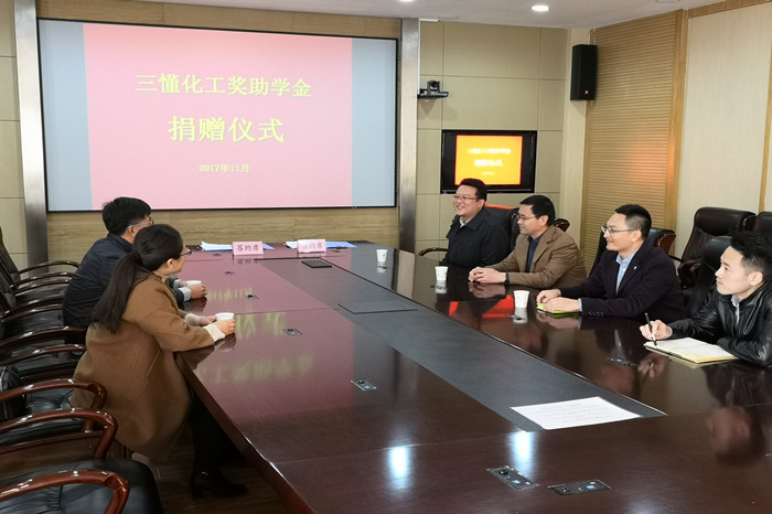 11月23日,青岛三懂化工有限公司捐赠仪式在四方校区第一会议室举行。化学院党总支书记王德宝、副书记张壮、青岛三懂化工有限公司董事长刘国林,化学院分团委老师等参加了捐赠仪式。