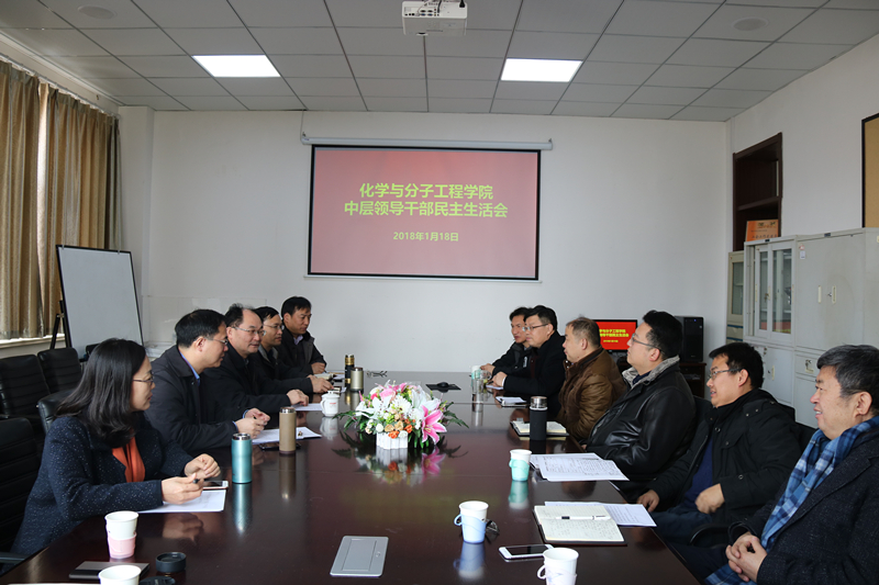 1月18日上午,化学院召开中层领导干部民主生活会,副校长刘光烨出席会议,化学院领导班子成员、生态化工国家重点实验室培育基地、肿瘤标志物传感分析教育部重点实验室、化学部党员中层干部参加会议,非中共党员中层干部、其他党总支委员列席会议。会议由化学院党总支书记王德宝主持。