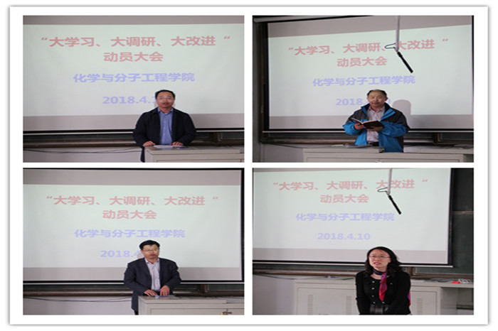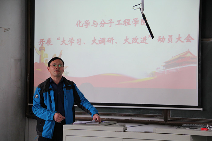 为落实学校关于开展“大学习、大调研、大改进”部署要求,4月10日下午,化学院在第一教学楼302室召开“大学习、大调研、大改进”动员大会,会议由化学院党总支书记王德宝主持,化学院党政领导及全体教职工参加大会。