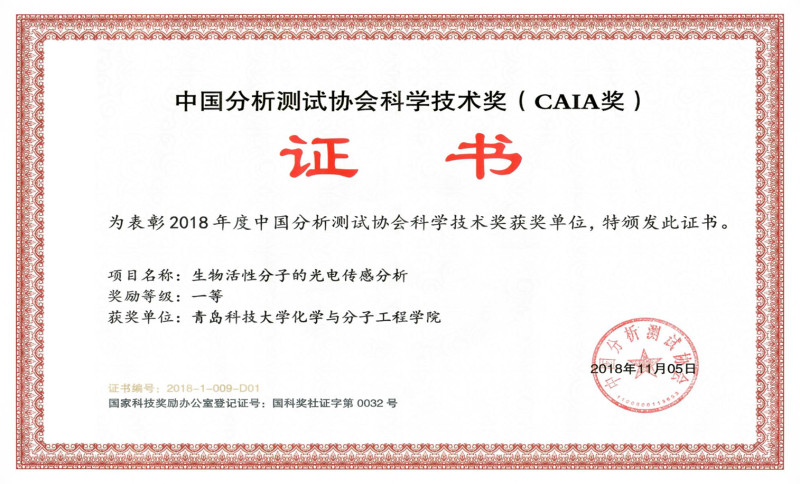 “CAIA奖”2015年经国家科学技术奖励办公室正式登记批准,是我国分析测试领域唯一的国家正式承认的社会力量设立的科学技术奖。该奖设立于1993年,每年评审一次,旨在奖励分析测试领域新原理、新方法、新技术和新应用研究中取得优秀成果的科技工作者和组织单位。“生物活性分子的光电传感分析”项目的研究成果是构建在复杂生物样品中实现特异性检测的光电化学生物传感新体系,通过对活性分子的可视化监测以及靶向药物释放,实现对肿瘤细胞的抑制从而达到化疗的效果,可以广泛应用于疾病诊断及医养健康等领域。后续工作中,该项目将与青岛市多家医院交流合作,进行大量的实际样品检测和临床医学应用。