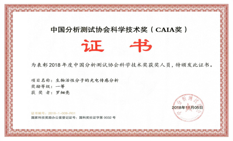 12月6日,中国分析测试协会第八届理事会第三次会议暨中国分析测试协会科学技术奖(简称“CAIA奖”)颁奖仪式在北京召开,会议隆重表彰了2018年度中国分析测试科学技术奖的获奖单位和个人。永利y23455院长罗细亮等人主持申报的项目“生物活性分子的光电传感分析”荣获本年度 “CAIA奖”一等奖,是学校首次获得该领域的最高奖项。