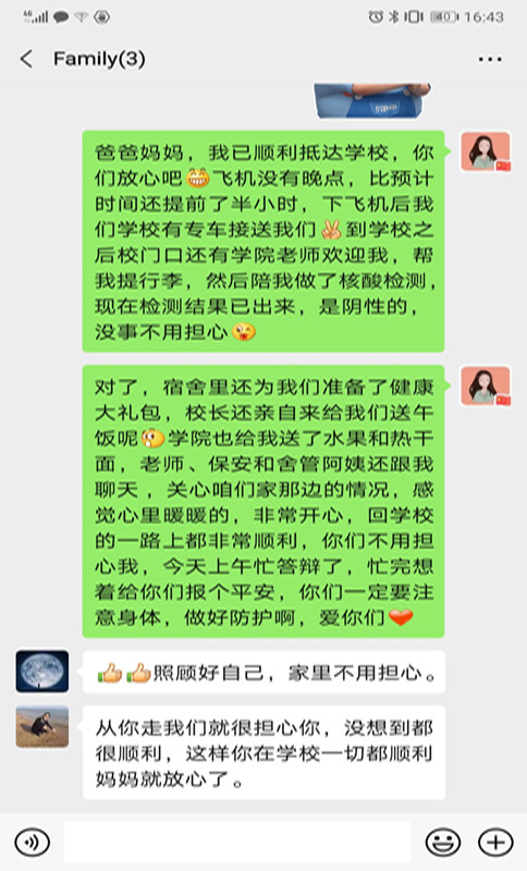 在学校、学院的精心安排和部署下,近几天学生们陆续平安返校、安心进入正常学习状态。学院鼓励学生们及时跟家里报平安,在特殊时间消除父母的担忧,让家人放心。在一封封短信家书中,体现了广大学生返校后开心的心情和幸福的感受。据悉,接下来化学院将继续以细心、高效、温情迎接一批批返校学生。