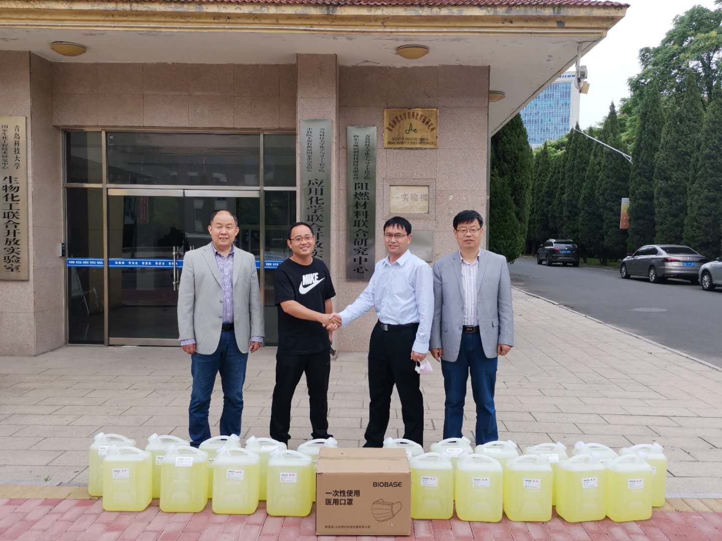 在听到学生返校学校防疫物资紧张时,公司立刻决定无偿向学校捐赠1000个医用防护口罩和200公斤高浓缩消毒液,并于走访当天派专车送达学校四方校区。化学院王德宝书记代表学院接受了捐赠,并对企业的慷慨解囊表示了感谢。
