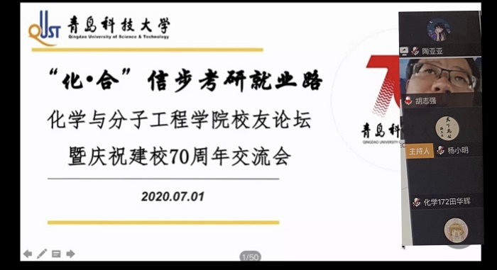 为帮助大三学生明确目标、掌握考研技巧,将最初的化学梦与就业、考研结合起来,7月1日,永利y23455举办了“化合--信步考研就业路”校友讲坛暨庆祝建校70周年线上交流会,校团委副书记张玉、化学院副院长胡志强、化学院党委副书记杨小明参加了本次交流会。