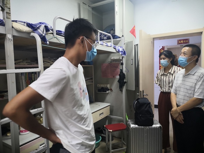 8月27日上午,化学院老师去到学校南二门考察学生入校的登记工作,保障了学生开学进入校园的秩序性,使得返校的第一道防线更加稳固。27日下午,化学院领导深入学生宿舍,与学生们走访交流。在本次走访过程中,老师们与学生就返校后宿舍环境问题,是否适应返校生活问题进行了面对面交流。通过交流,学院老师们更加清晰的知道了部分学生返校遇到的一些问题。学生们也了解到了为了迎接学生们开学,学校做了包括消毒,清扫在内的多项准备工作。