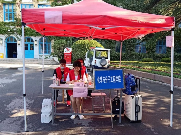 清晨,新生在西门和南二门通过体温监测、健康码查验和身份核实等一系列过程,陆续进入校园。为了让新同学在开学伊始就能感受到学校的关怀,更快地融入新的环境,化学院学生会为研究生新生报道提供了志愿服务。新生进入校园后,在志愿者的带领下到达指定地点登记信息,缴费,并领取相关的物品。另外,志愿者通过抖音平台进行了直播,向大家展示了新生报到的过程,并对校园里的标志性建筑进行了讲解。