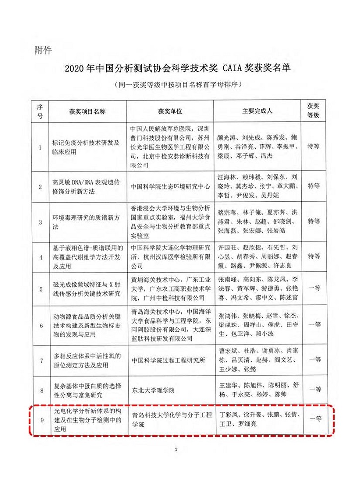 11月06日,2020年中国分析测试协会科学技术奖(CAIA奖)获奖名单公示,化学院丁彩凤教授申请的“光电化学分析新体系的构建及在生物分子检测中的应用”科研项目,喜获一等奖。
