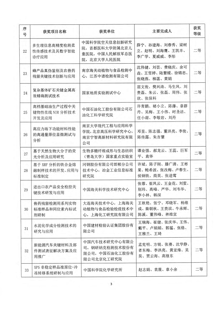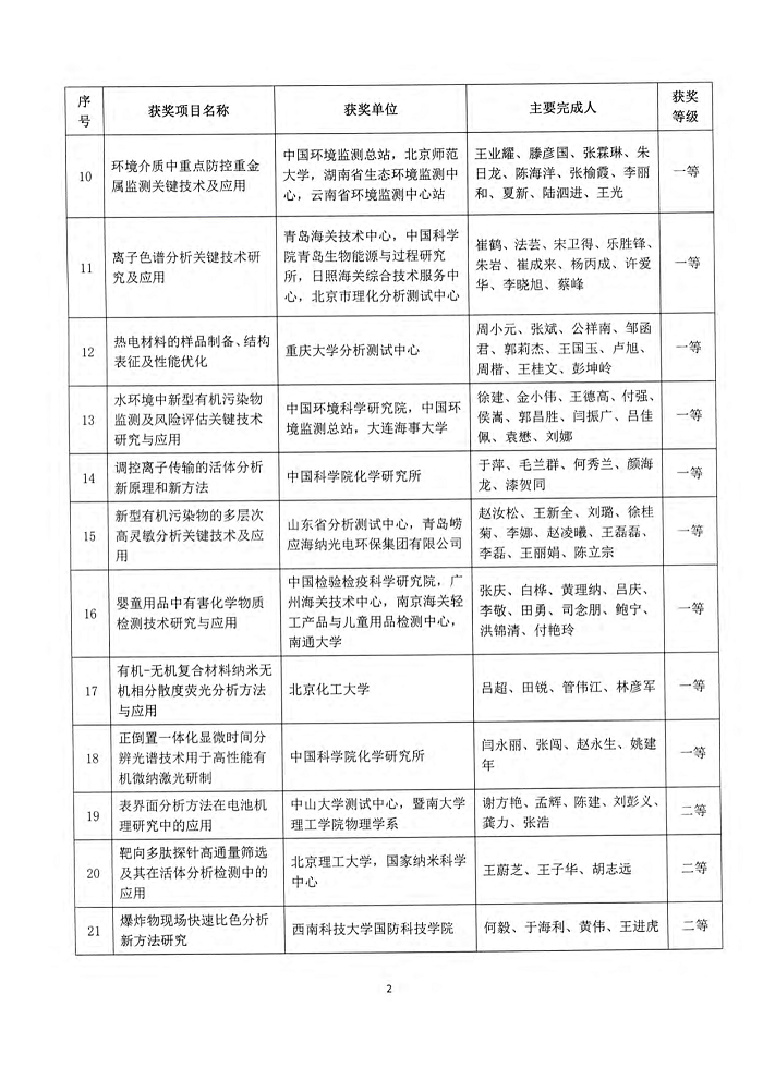 为了奖励在分析测试领域新原理、新方法、新技术和新应用研究中取得优秀成果的科技工作者和组织,中国分析测试协会于1993年设立了“中国分析测试协会科学技术奖(CAIA奖)”。该奖项2015年经国家科学技术奖励工作办公室评估并批准,具有直接推荐国家科学技术奖的资格。根据《中国分析测试协会科学技术奖(“CAIA奖”)评选办法》的有关规定,经形式审查、函评、会议评审和综合评选,2020年度中国分析测试协会科学技术奖CAIA奖共33项,其中特等奖4项,一等奖14项,二等奖15项。中国分析测试协会拟于2020年12月10日在协会第八届理事会第五次会议上举行颁奖仪式。
