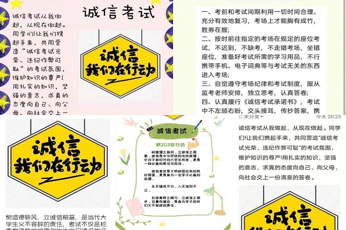 为严肃考风考纪,加强研究生对诚信、公正、平等的认识,在新生第一次考试周到来之前,研究生辅导员程丽率先对研究生如何在考试中践行诚信的问题,在线上发出倡议,研究生新生各班纷纷发起倡议,制作了班级倡议书,进行了线上宣誓,并表示无论何时何地,都将保持诚信。