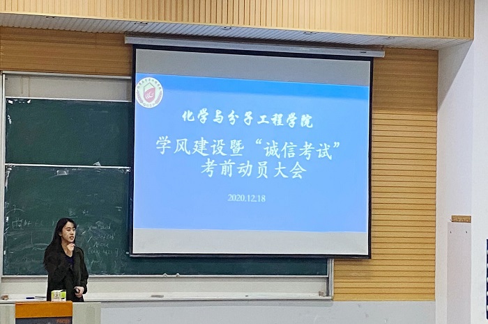 陶亚亚分别于12月18日、12月24日组织化学院2020级学生于二号教学楼101召开学风建设暨“诚信考试”考前动员大会,对考风考纪、诚信考试及考试相关信息和注意事项进行了强调,并对学生发出了诚信考试倡议。同时,陶亚亚通过对具体事例的讲述,点明了考试不止是对学生们学习的一次检验,也是对行为素质和诚信准则的一次检验,让同学们意识到诚信考试的重要性。