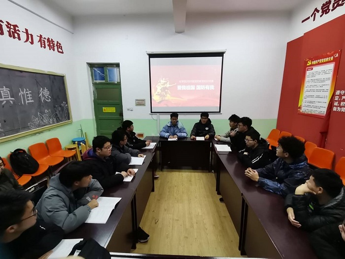 11月7日,化学院2020级学生以班级为单位进行了国防知识学习,加强了同学们对国防知识的了解;11月15日,2020级各班代表参与了“爱我国防 国防有我”国防知识竞赛,进一步增强了同学们对国防知识的学习热情,形成了良好的国防氛围。随后,各团支部召开了“强国防教育 展青春风采”主题班会,讲述自己身边的国防故事,用生动形象的例子再次强调了国防对于青年学生的重要性。邀请老师为学生做专题报告,开展国防教育形势与政策讨论会,征兵政策宣讲会,让学生了解国家、学校的征兵政策,正确认识现在的大环境,正确的表达爱国热情。