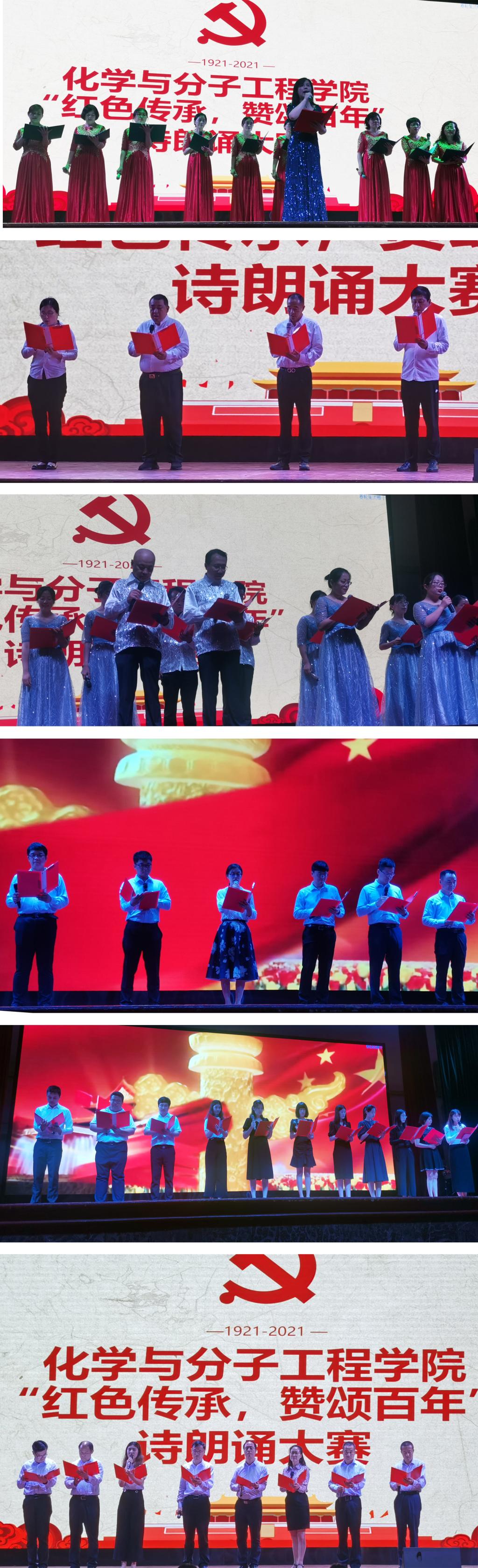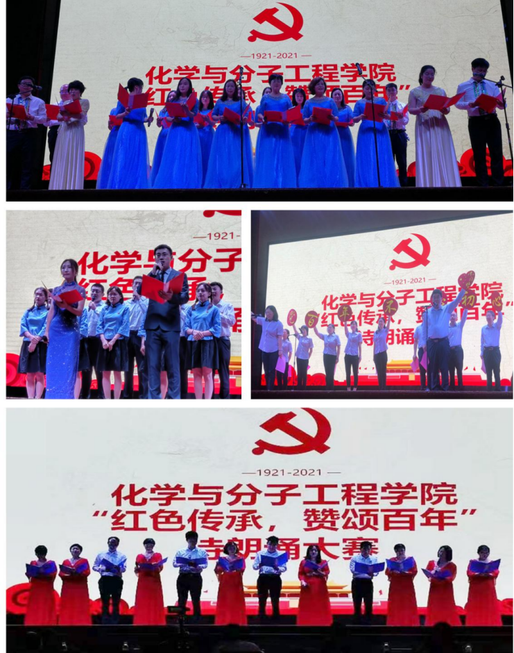 为庆祝中国共产党成立100周年,传承红色基因。6月15日,化学院在西礼堂举行 “红色传承,赞颂百年”诗朗诵大赛。本次比赛由化学院分工会组织,院领导出席并参加了比赛,相关教研室负责人担任比赛评委,学院教职工与毕业生一同观看了比赛。