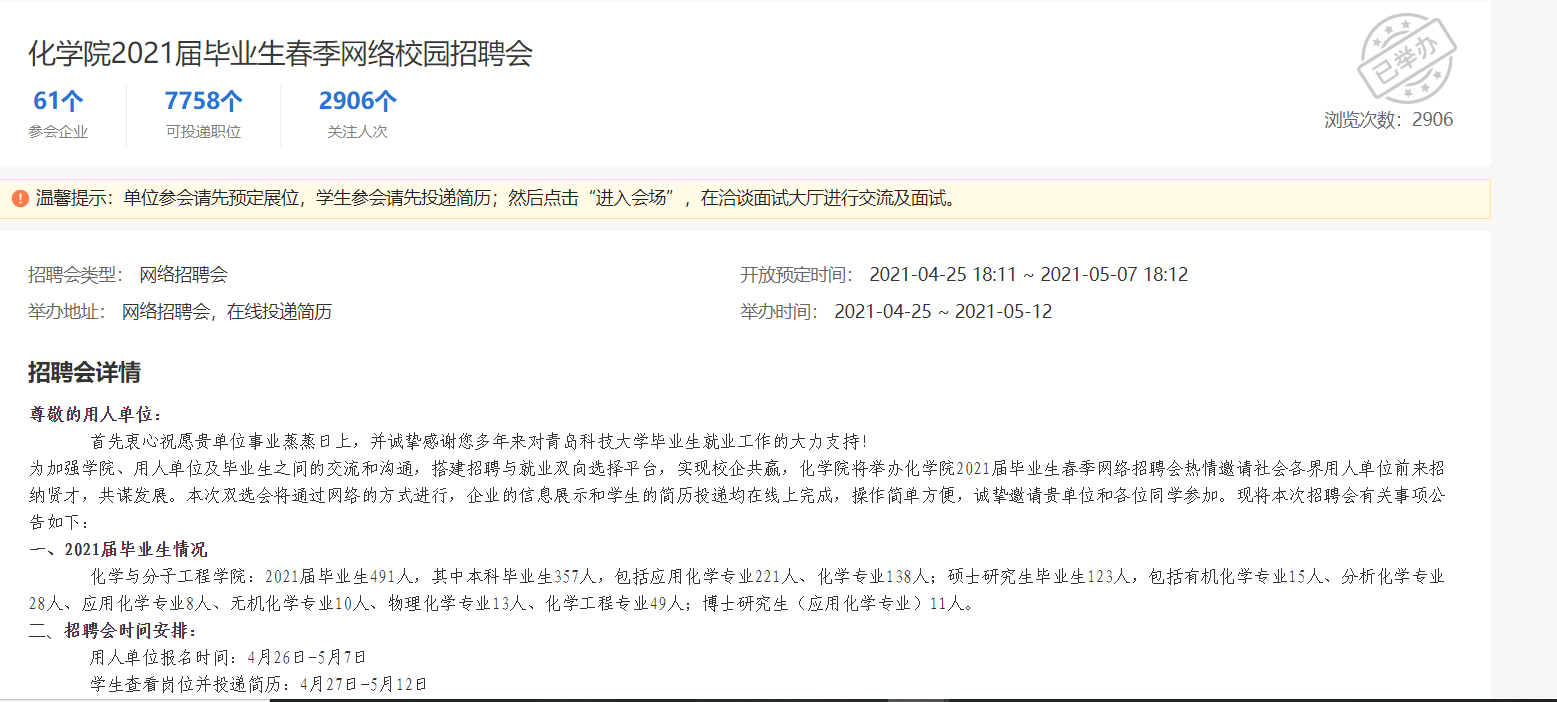 为有效做好疫情常态化防控机制下就业工作,积极搭建毕业生与用人单位的交流平台,化学院2021年4月25日至5月12日成功举办2021届毕业生春季网络校园招聘会。