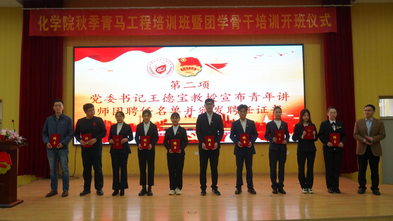 开班仪式上,王德宝宣布学院“青年讲师团”聘任名单并为“青年讲师团”成员颁发聘任证书。化学院成立青年讲师团是深入学习贯彻习近平新时代中国特色社会主义思想和党的十九大精神,深刻领会习近平总书记关于青年工作的重要思想,持续深化“青年大学习”行动、加强学院青马工程培训的重要举措,讲师团由学院三名优秀青年教师和七位优秀保研同学组成。