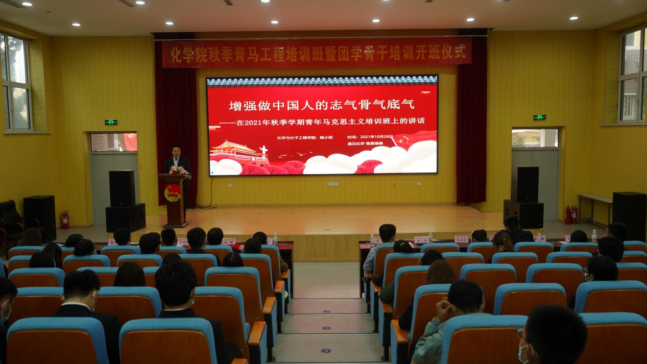 为深入贯彻落实习近平总书记关于青年工作的重要思想,按照团中央文件《青年马克思主义者培养工程实施纲要》和学校团委相关部署要求,10月26日下午,化学院2021年秋季青马工程培训班暨团学骨干培训开班仪式在四方校区尚舜报告厅举行,化学院党委书记王德宝教授、校团委兼职副书记、艺术学院李猛副教授、化学院党委副书记兼副院长杨小明老师、分子科学与工程教研室主任吕健教授、有机化学教研室郭维斯副教授、化学教研室宋志灵副教授以及学院团委全体辅导员老师、学院青年讲师团成员以及此次“青马工程”培训班学员共计100余人参加本次活动,活动由学院团委书记刘施施老师主持。