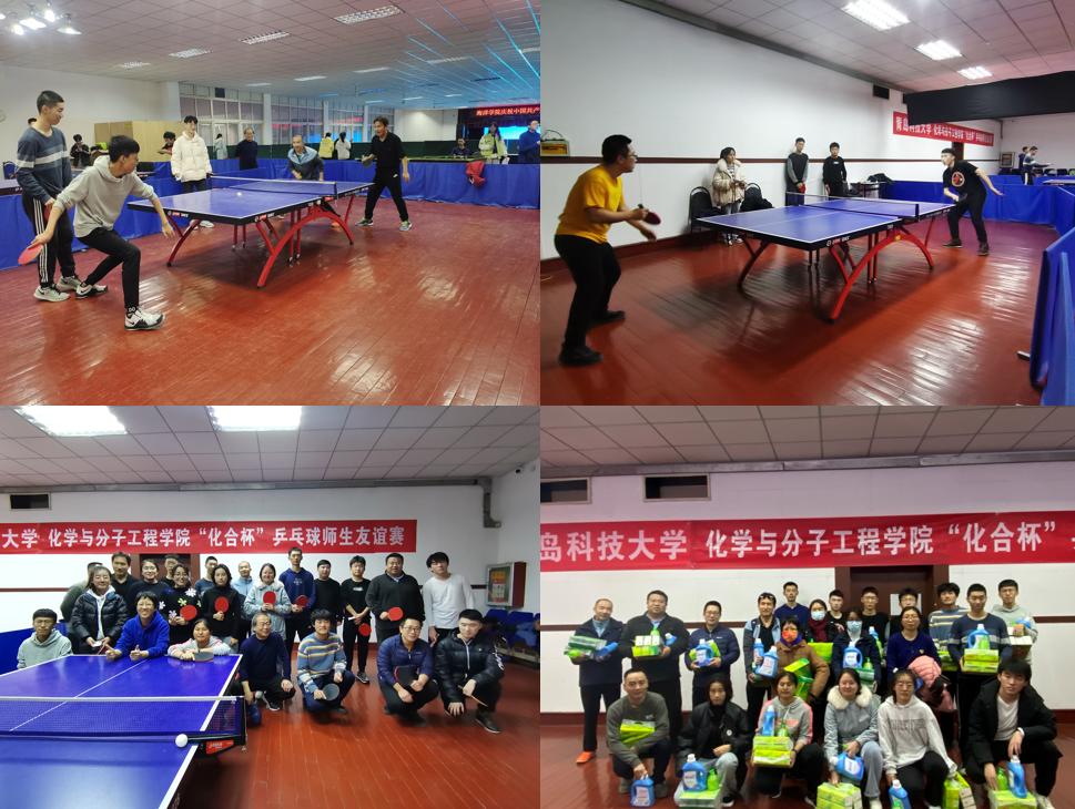 为丰富我院师生的业余文化生活,响应学校“爱体育·兴科大”的号召,达到相互交流,促进感情,锻炼身体,增强体质的目的,激发广大师生参与体育活动的热情,化学院于12月7日下午在西礼堂二楼乒乓球活动室举办“化合杯”乒乓球师生友谊赛,比赛展示了化学院师生“惟真惟德”风貌,不仅切磋了球技,更增进了师生情谊。