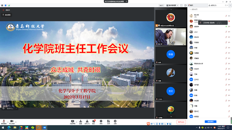 加强组织领导,压实防控责任。3月13日,化学院召开疫情防控线上工作会议,学院领导班子成员,全体教职工参加会议。会议传达了学校疫情防控工作会议精神,对下一阶段学院疫情防控工作做了详细部署,要求相关负责人按照学校要求落实安全责任,切实做好学院的安全稳定工作,同时研判、创新线上教学平台、远程科研安全、管理服务到位等工作,确保线上教学、科研高质量运行。