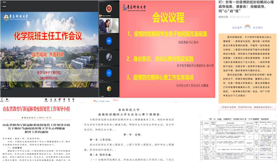 组织学习《山东省教育厅新冠肺炎疫情处置工作领导小组关于做好当前疫情形势下学生心理健康教育工作的通知》和《yl23455永利集团疫情防控期间大学生应急心理干说预预案》,组织学院班主任、团学骨干、心理委员等开展线上心理疏导业务培训,在学院“微观化院”公众号发布《同“心”战“疫”,排解疏导,——做好疫情防控封校期间的心理疏导》推文,制定学院“3·25善爱我”活动规划。