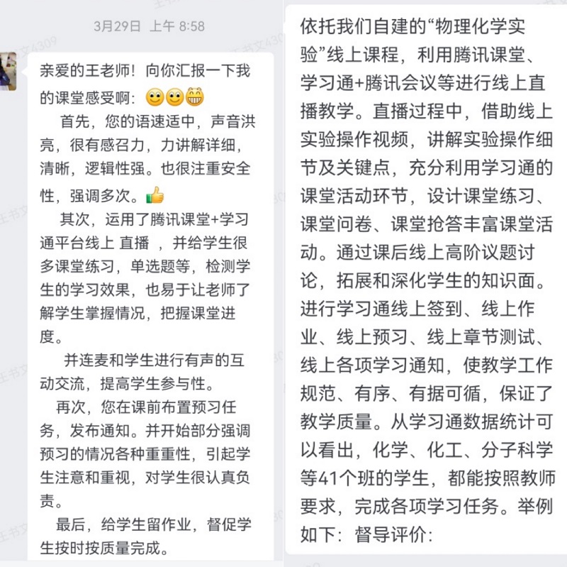 与会老师首先对于校园封闭化管理以来的化学实验课程线上教学情况进行总结,交流经验做法,发现问题短板。疫情防控常态化校园封闭化管理背景下,化学院基础化学实验中心依托自建《无机及分析化学实验》《有机化学实验》和《物理化学实验》三门山东省联盟在线开放课程和学银在线开放课程,适时启动线上教学。学院教学督导唐林老师介绍了基础化学实验课程的督导工作和教学评价情况,各位线上督导员对实验课老师们的创新授课做法和实验课程效果给予高度评价。基础化学实验中心的《物理化学实验B》《有机化学实验》 获批山东省线上线下混合式一流本科课程,课程建设的经验做法和教学改革的实践历程为化学人才培养工作提供了有力支撑。