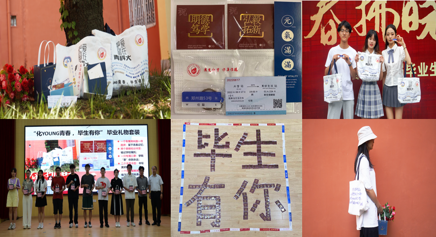 为毕业生专门设计制作赠送一套“化young青春,毕生有你”系列礼物套装。一个个人专属的“郑州路53号”路牌,留下青科四方独家记忆;两个黄铜校训书签,秉承科大家训家风;一只特色口罩,学校“罩”你到永远;两个手签书签,签署美好祝福;一个定制版“把爱留在青科大”帆布包,包下所有青科青春记忆和未来所有美好;一张包含个人信息的专属高铁票,一路顺风,通向美好。