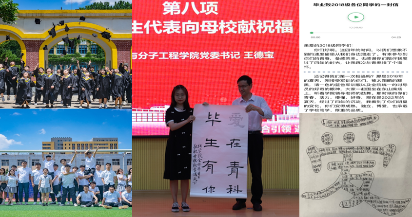 面向全体毕业毕业生开展“毕生有你,化院有话”毕业季系列征集,分别开展毕业季最美三行情诗征集,“我与科大合个影”征集、毕业感悟短文征集、毕业感悟短视频征集、最美毕业照征集。毕业生以图片、文字、视频的形式表达毕业离别情愫、对科大的感恩和对各赴前程的美好祝福。毕业生王采林书写包含556名毕业生签名的“爱在青科,毕生有你”书法作品向母院送上祝福。辅导员为毕业生书写最后一封信。