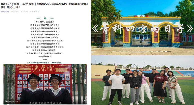 留住青科四方记忆,改编制作发布学院2022届毕业生毕业MV——《青科四方的日子》, MV以青科四方四年生活为背景,串联四年点滴生活,铸就青春美好记忆。用真心和真情为毕业生留下专属的毕业记忆。忆青春芳华,赴璀璨星河。作品在学院公众号《微观化院》上线发布,并得到同学们的喜爱和广泛传播。