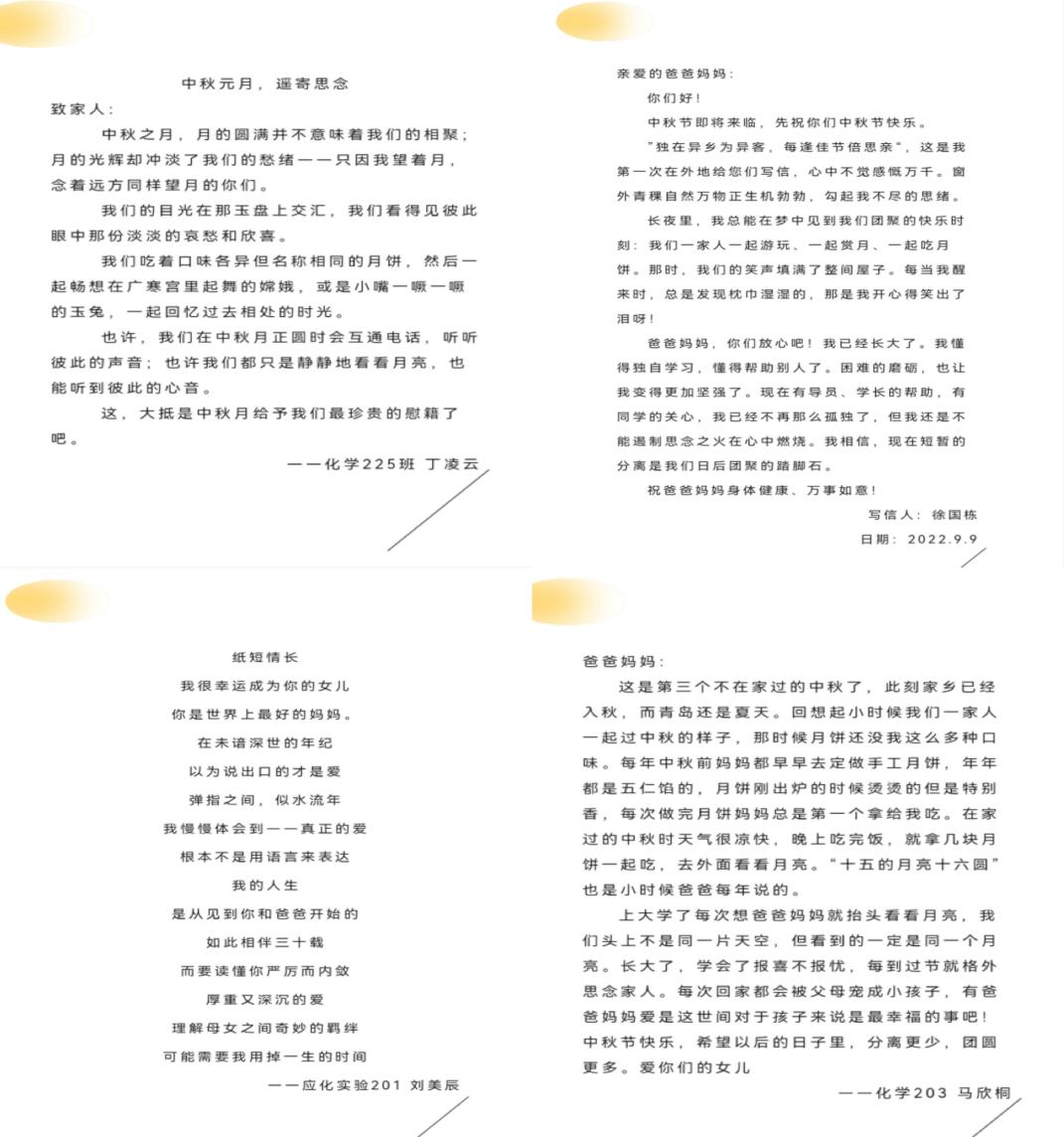 手写家书暖心。中秋节前夕学院组织“一封家书寄相思”活动,中秋节当天学院“微观化院”公众号收到了许多新生投稿,内容情真意切,体现了同学们浓浓的思乡之情与对家人满满的爱。