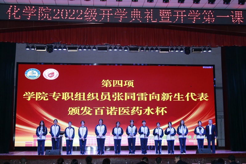 开学典礼上,曹永俊、陈兵为2022年度国家奖学金获得者颁奖。张同雷向新生代表颁发百诺医药水杯。