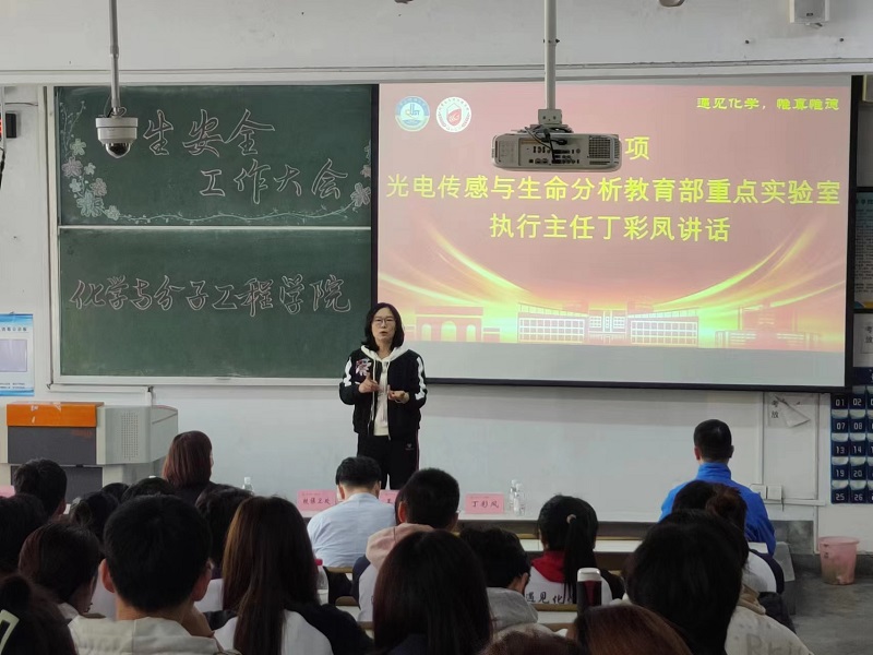 丁彩凤就实验室安全工作向同学们进行说明。丁彩凤指出:实验室安全意识、实验室安全规范知识、实验室安全操作是实验室安全的三个法宝。丁彩凤重点强调了开展实验务必了解所用药品的理化性质、仪器设备的工作原理等。最后,丁彩凤指出,无人值守开展实验是实验室安全事故的头号杀手,学校学院将加大力度对于无人值守的检查力度并进行严肃处理。