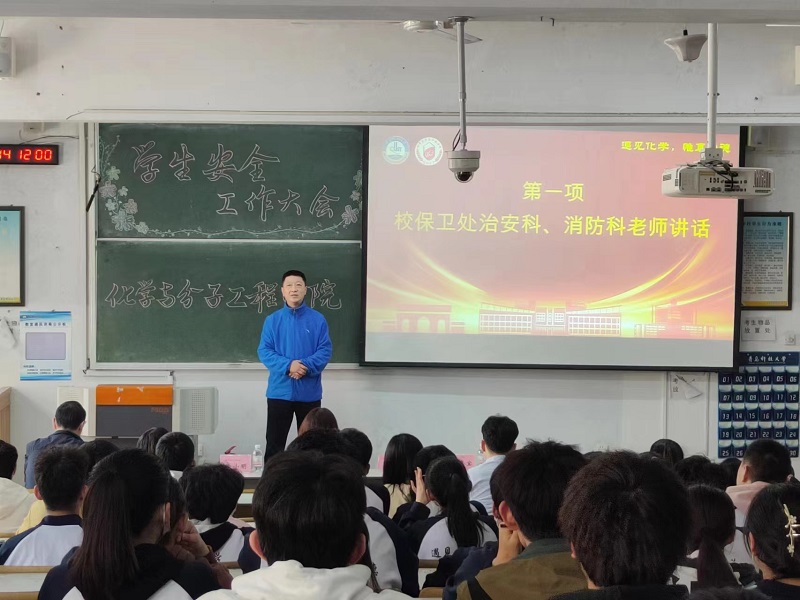 3月7日,化学院学生安全工作大会在三号教学楼202室举行。校保卫处消防科仇立峰、校医院纪永丽、学院党委书记王德宝、光电传感与生命分析教育部重点实验室执行主任丁彩凤、全体辅导员、化学院本硕博班级全体团支书、班长参加会议。会议由学院党委副书记杨小明主持。