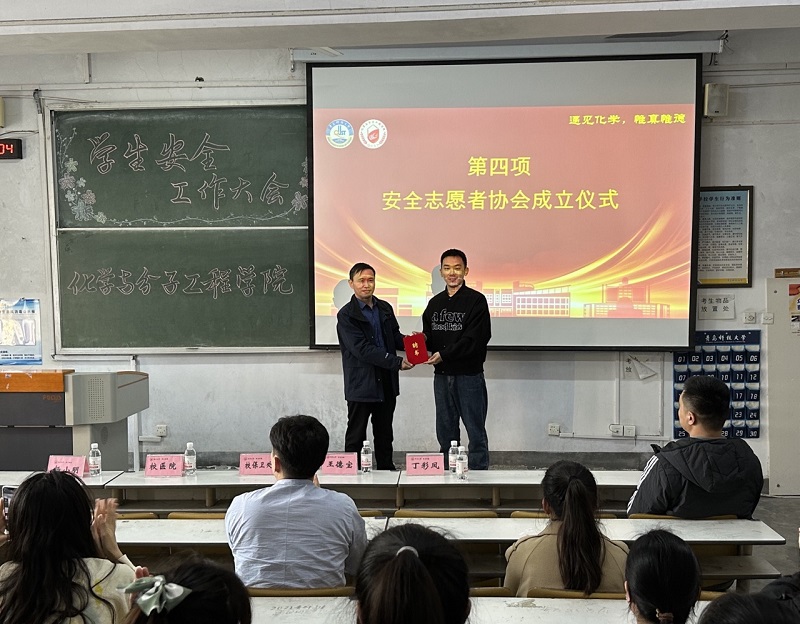 王德宝向化学院安全志愿协会志愿者代表颁发聘书并讲话。王德宝指出:安全工作压倒一切,没有安全没有一切,班长团支书要牢固树立、带头践行总体安全理念。安全志愿者代表吴琼唯代表全体志愿者发言,安全志愿者代表王磊宣读了《永利y23455校园安全倡议书》。会上还观看了实验室安全、校园安全的视频纪录片。