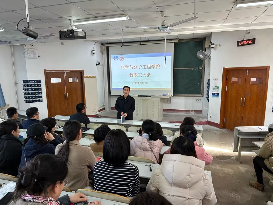 为谋新篇、开新局,统一思想,凝心聚力,确保新学期各项工作平稳、有序、高效地开展,3月12日下午,学院召开全体教职工大会。会议由化学院党委书记肖强主持。