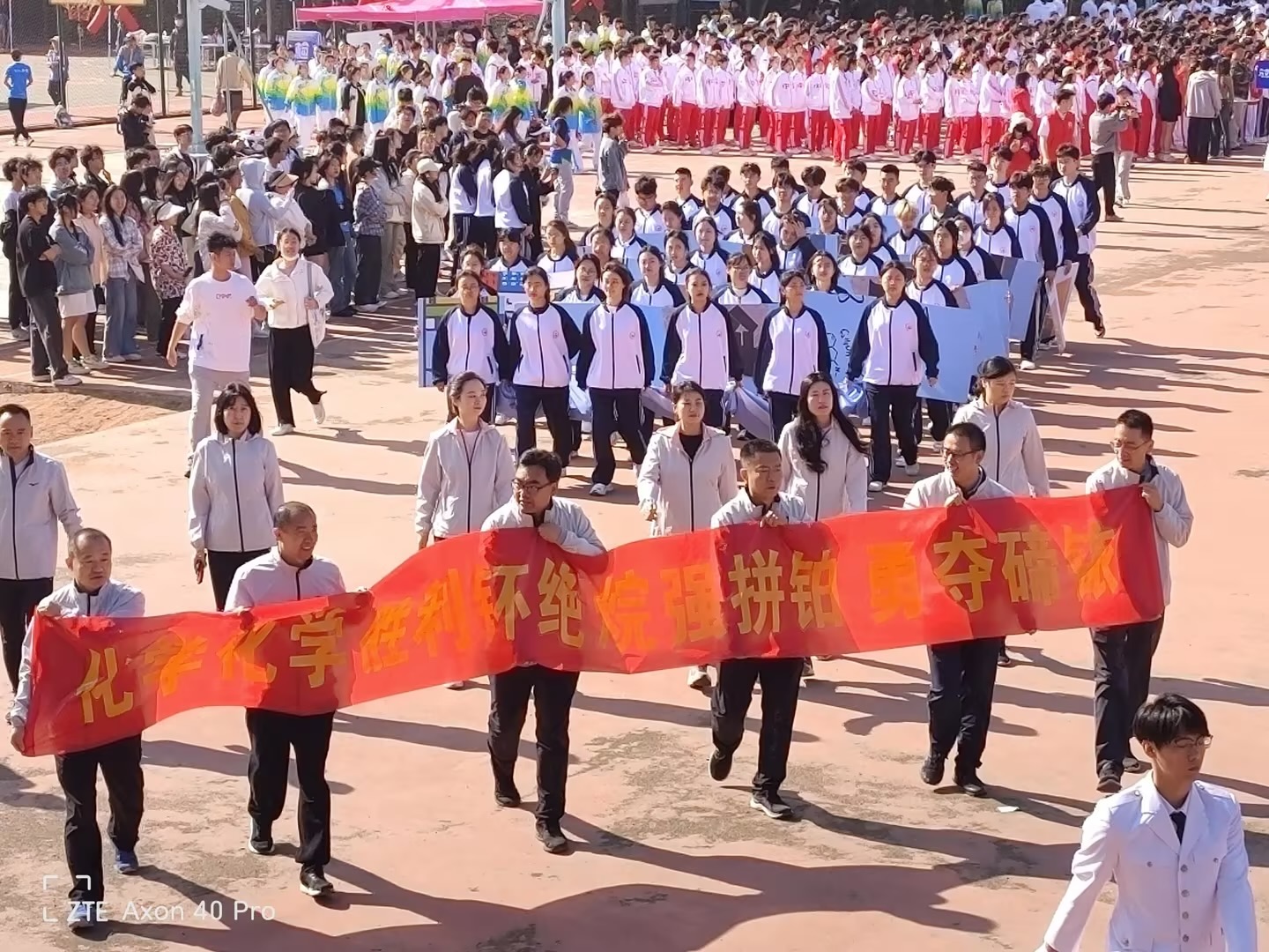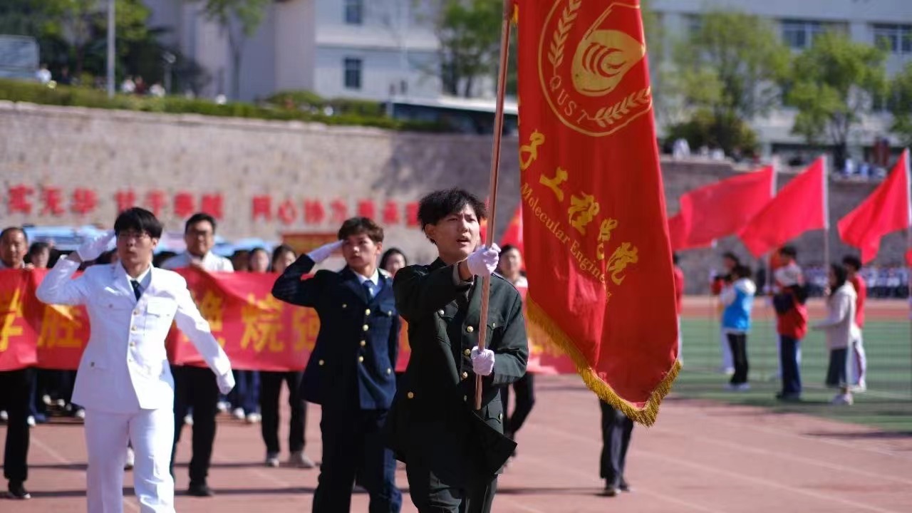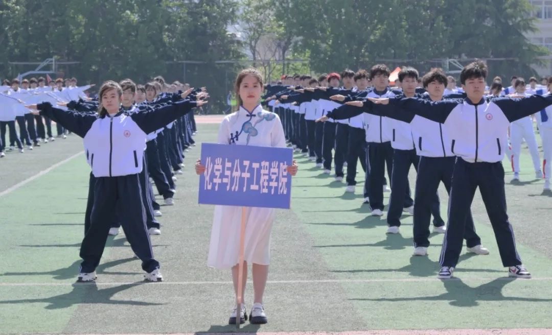化学院方队精神抖擞,意气风发笑容灿烂,活力四阔步走向主席台尽显化院师生的赤诚之心和奕奕神采。