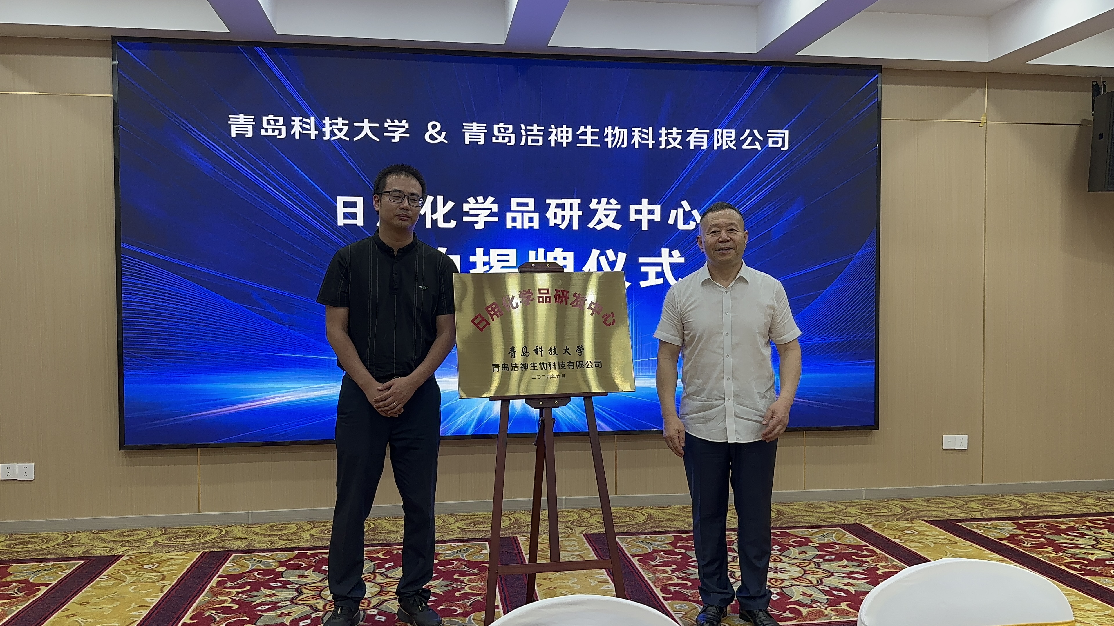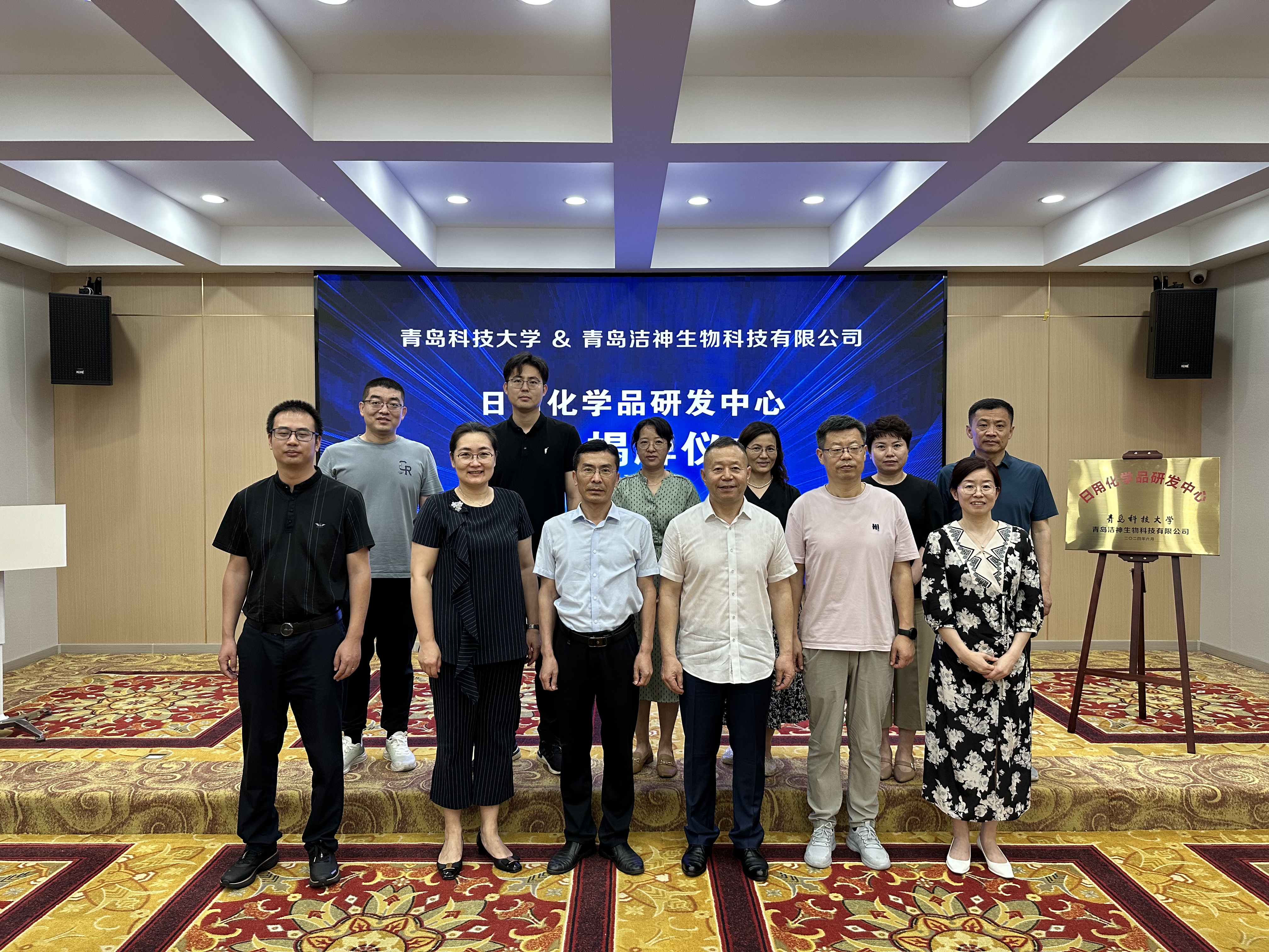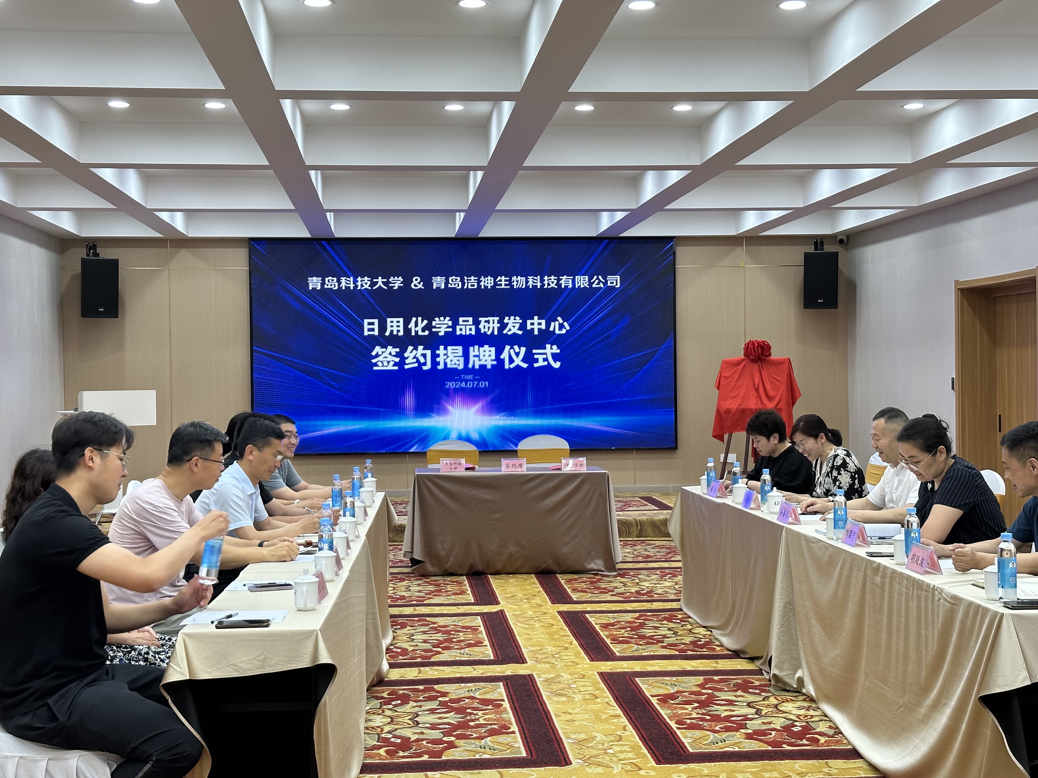 7月1日,化学院与青岛洁神生物科技有限公司日用化学品研发中心签约揭牌仪式在洁神智慧管理园区举行,学院党委书记肖强、常务副院长汪恕欣、青岛洁神集团董事长孙善家、青岛洁神生物科技有限公司总经理刘晓静、李沧区振华路街道党委书记刘国宁、学院副院长胡志强、教师代表、辅导员代表、青岛洁神生物科技有限公司相关负责人、李沧区振华路街道相关工作人员等10余人参加活动。