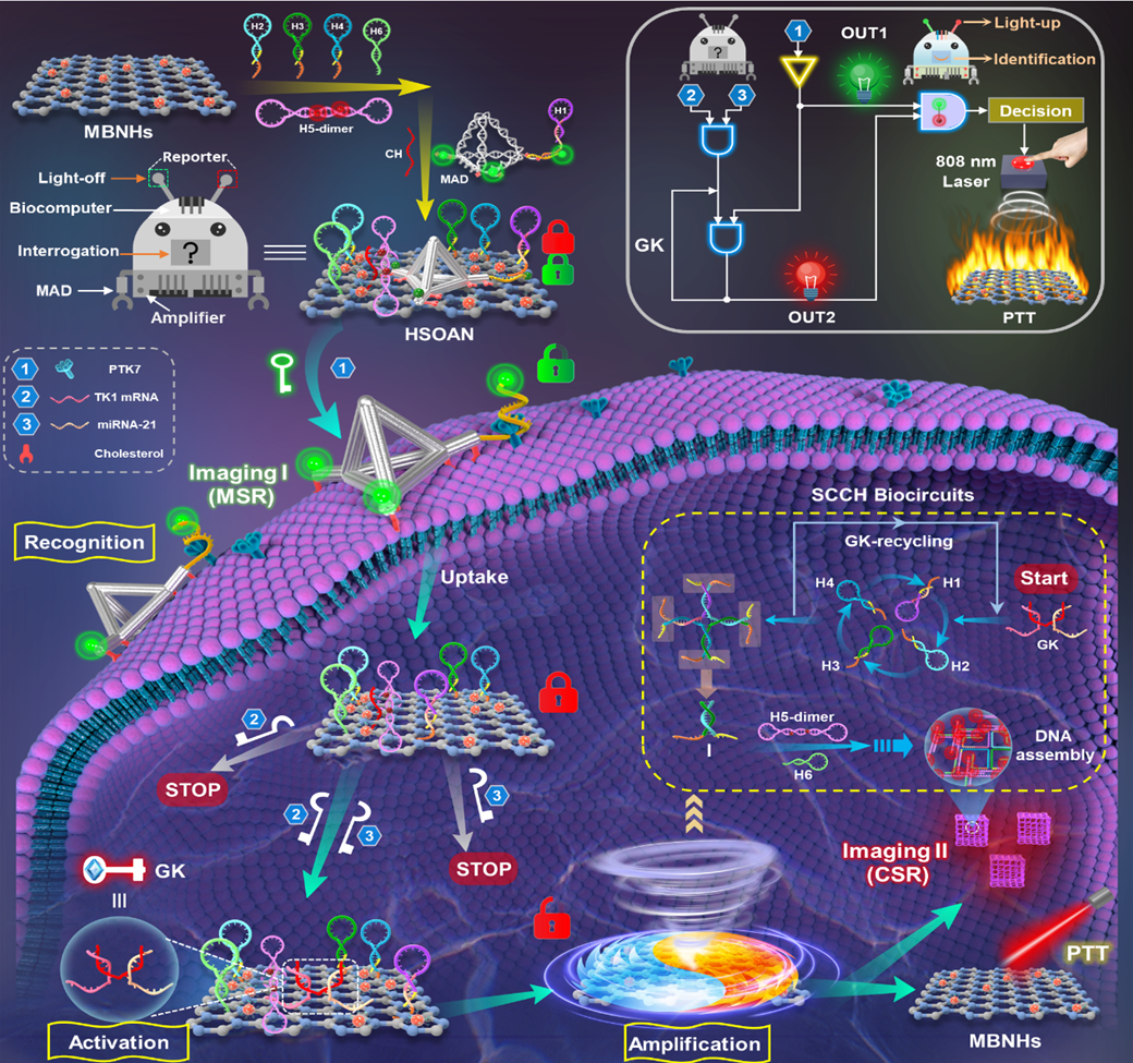面对这些问题,yl23455永利集团化学院周宏教授、何鹏副教授团队在Chemical Engineering Journal(IF=13.3)发表了题为“Intelligent Operation-Activated Dual Light-Up Nanointerrogator for On-Site High-Performance Bioimaging”的研究。团队开发了一种智能“分层扫描-运算-自动反馈”纳米询问器(HSOAN),用于精确的细胞识别和个性化光疗。将“生物计算机”与“电路放大器”有效结合,并选择多种生物标志物作为计算输入,基于“YES-ANDI-ANDII”逻辑门顺序感应膜蛋白 PTK7 和细胞质 TK1 mRNA 和 microRNA-21 基因。经历自上而下的扫描-识别,纳米询问器仅在具有三位生物编码的靶细胞中实现空间特异性双色信号输出。研究表明“双锁-三钥匙-双报告器”控制的纳米询问器提高了细胞识别的准确性。工程化框架支撑的膜锚定装置和放大电路介导的超支化组装增强了成像信息的稳定性。 而且,MBNHs的高光热转换效率和生物安全性为肿瘤定制化治疗提供了优异的治疗效果。