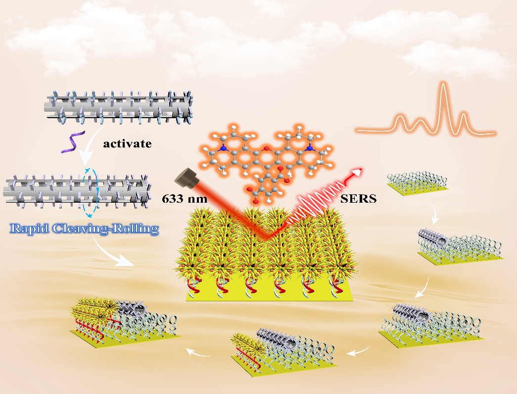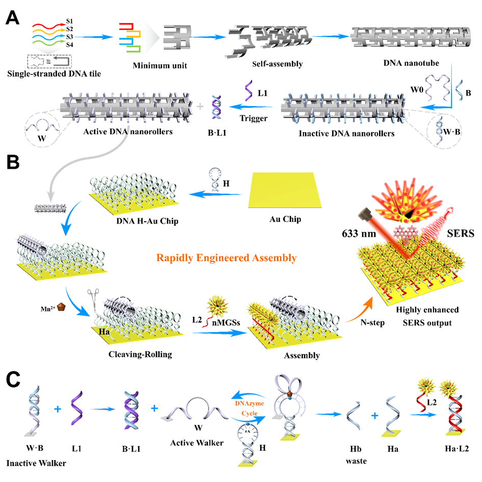 面对这些问题,yl23455永利集团化学院周宏教授、何鹏副教授团队在Advanced Functional Materials (IF=18.5)发表了题为‘’High-Density Arrangement of Biomimetic Plasmonic Nanoprobes Guided by DNA Nanoroller based Cleaving-Rolling Process for SERS Sensing Analysis‘’的研究。受农业联合机械化的启发,团队构建了一种独特的剪切-滚动-组装集成纳米器件(CRAIN),用于多种生物分子的高性能检测。在设计中,引入 DNA 纳米管作为构建载体,以设计具有DNAzyme步行链的多取向DNA 纳米辊,从而有效增加反应取向和局域浓度。通过目标特异性识别,激活的纳米滚轮可以自主地沿着金基板上的发夹轨道进行循环地剪切和滚动,从而显著提高反应速率。此外,使用核酸编码的海胆形金银复合纳米球(nMGS)作为SERS增强探针,通过剪切-滚动过程介导的nMGS探针的受控组装促进了高密度热点域的形成,进一步改善了检测灵敏度。而且,作为一种智能化的通用平台,CRAIN系统可以扩展用于多种分析物的高灵敏度分析,例如microRNA-21、丁酰胆碱酯酶活性和有机磷农药等。该研究展示了DNA 纳米辊在生物传感领域的广泛应用潜力,这种集成化组装策略为临床诊断、生物医学工程和环境科学提供了新的研究视角。