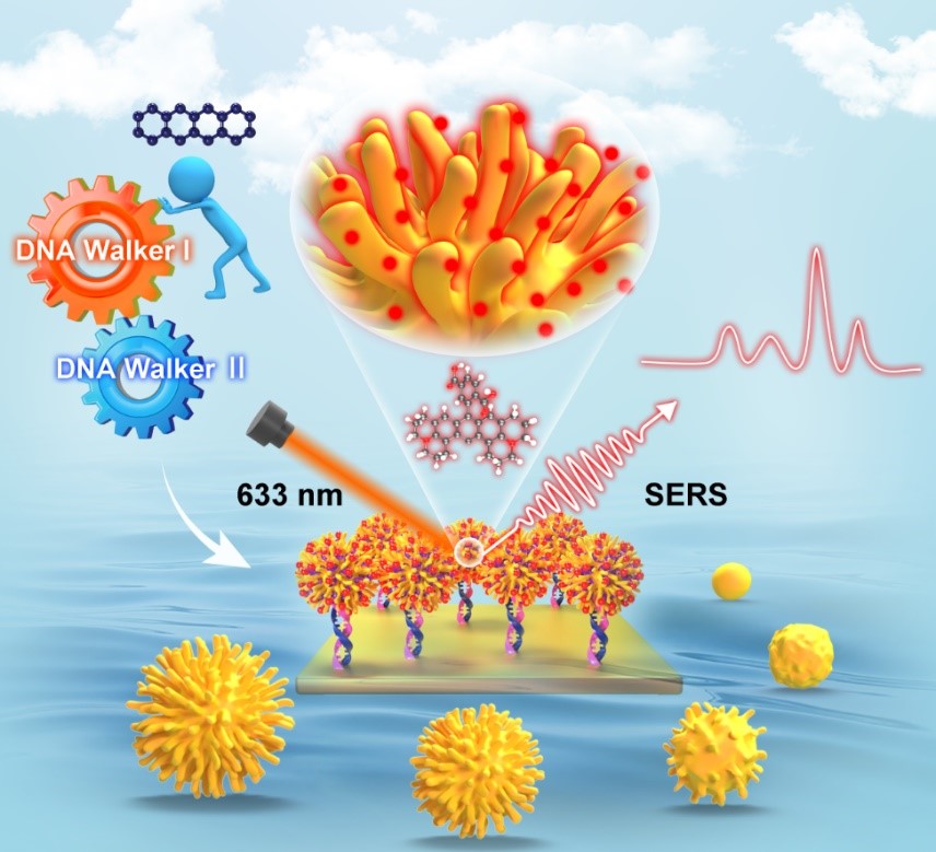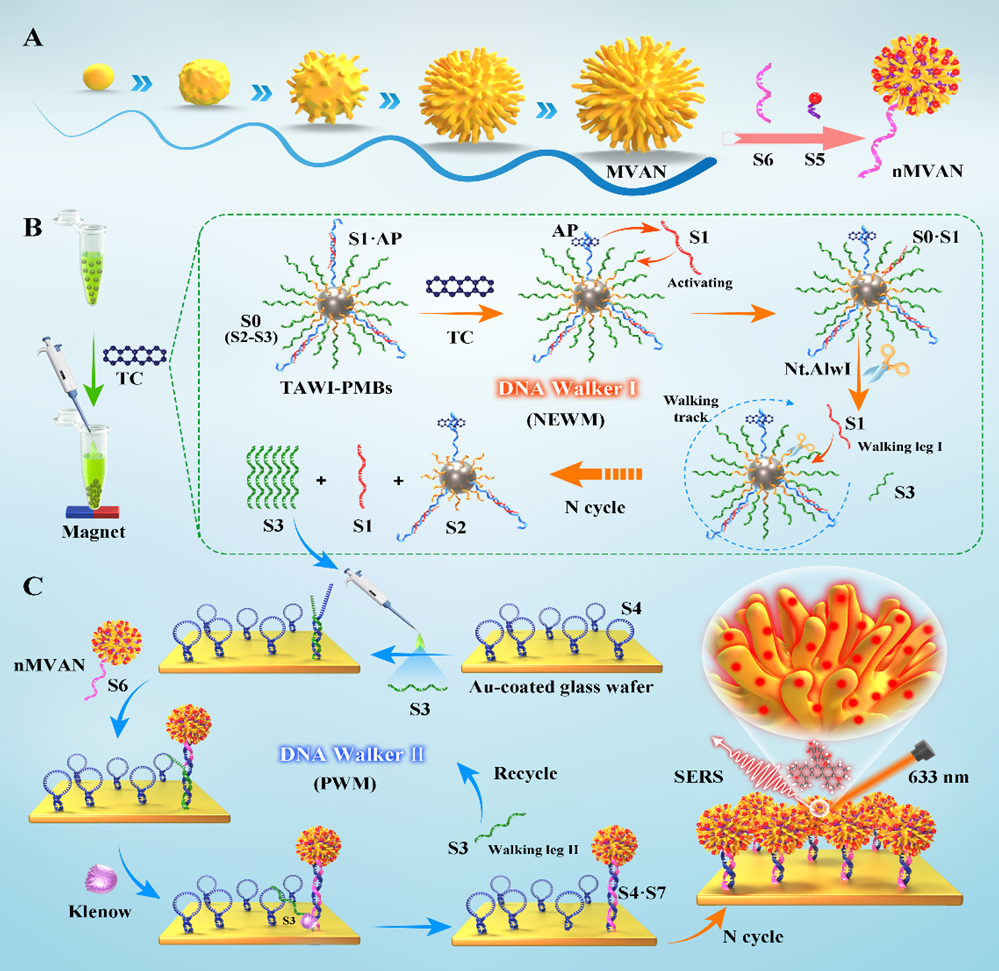 针对以上挑战,yl23455永利集团化学院周宏教授团队、何鹏副教授在Small(IF=13)上发表了题为“Engineering Assembly of Plasmonic Virus-Like Gold SERS Nanoprobe Guided by Intelligent Dual-Machine Nanodevice for High-Performance Analysis of Tetracycline”的研究。该研究设计了一种新型的双机联动纳米器件(DMLD)。以挂锁适配体组件作为启动指挥中心,核酸编码的类病毒多刺突金纳米粒子(nMVANs)作为信号指示器,级联步行者电路作为处理器,实现了对TC的高性能分析。MVAN 中刺突顶点和刺突间纳米间隙的存在促进了强烈的电磁近场聚焦,为nMVAN的高SERS活性提供了保障。而且,通过多级Walker催化电路之间的顺序激活,DLMD系统能够将有限的TC识别转化为DNA扩增子引导的SERS探针的大规模工程化组装,从而实现全域等离子体热点的协同增强。高活性仿生探针和多机模块化设计的精巧结合这一构建理念凸显了智能纳米器件在分析环境和食品中的痕量危害物方面的巨大应用潜力。