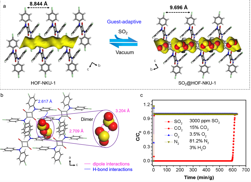 本研究报道的氢键有机框架材料(HOF-NKU-1)具有优异的SO2/CO2分离性能,SO2选择性超过7000,SO2储存密度(3.27 g cm-3)在所有基准材料中为最高值。与传统的依赖亲水性开放金属位点或M—OH位点的高性能SO2吸附剂相比,这些吸附剂通常会不可避免地导致高水吸附量和严重的竞争吸附,而HOF-NKU-1的水吸附量(17 mg g-1)在所有报道的SO2多孔吸附剂中最低(已报道的金属有机框架的水吸附量在160~820 mg g-1之间)。与传统的刚性或灵活框架材料相比,后者通常表现为选择性差或门控开压力过高,利用具有形状记忆效应(SM效应)和客体适应特性的临时相态的氢键有机框架实现了在低压区域的高吸附量和高选择性。单晶到单晶(SCSC)转变证实了SO2与框架的强相互作用导致了高密度SO2二聚体的堆叠,这正是其优异SO2捕获性能的原因。