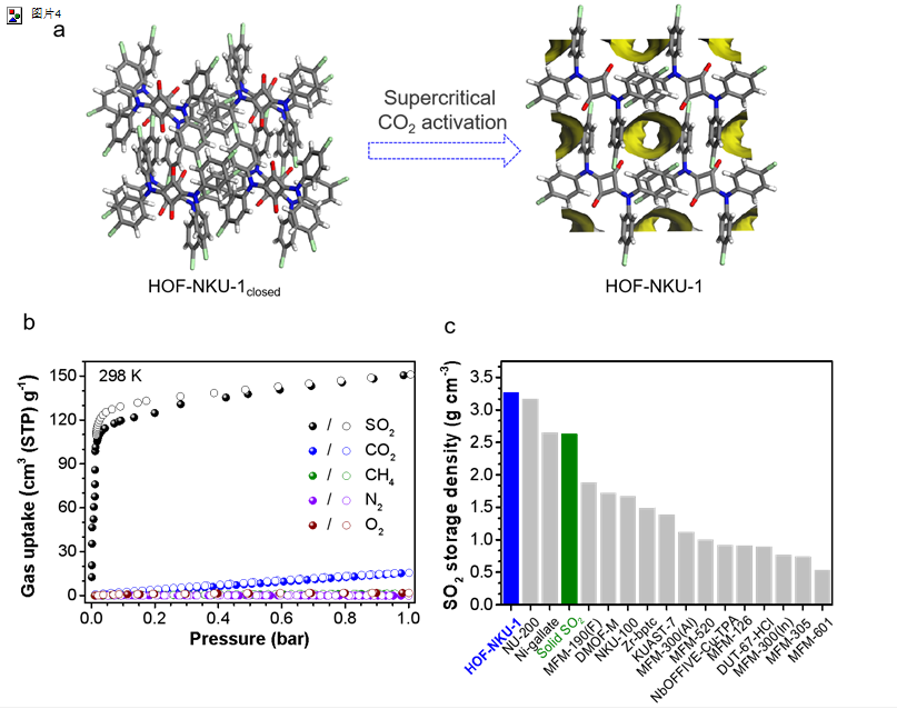 图1. a) HOF-NKU-1制备过程示意图;b) HOF-NKU-1在298 K条件下,SO2、CO2、CH4、N2和O2的等温吸附曲线;c) 常温下孔隙中SO2储存密度的比较。