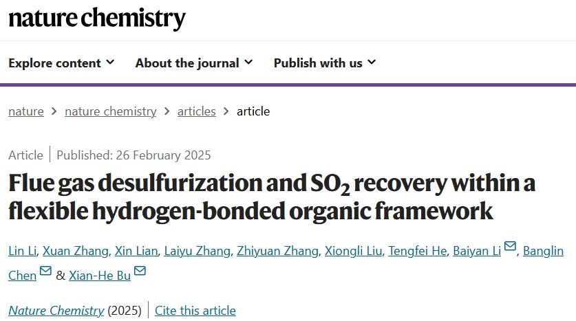 2025年2月26日,南开大学材料科学与工程学院卜显和院士/李柏延特聘研究员团队联合浙江师范大学/福建师范大学陈邦林院士团队在国际顶级学术期刊《Nature Chemistry》上发表题为“Flue Gas Desulfurization and SO2 Recovery within a Flexible Hydrogen-Bonded Organic Framework”的研究性文章。该研究提出一种自适应柔性氢键有机框架材料设计的新方法,此方法首次开发了一种兼具形状记忆和自适应孔道的疏水氢键有机框架材料,以解决在实际高湿度烟道气中选择性吸附二氧化硫(SO2)的难题,并通过解析负载SO2的单晶结构解释了分子层面的作用机理,对于进一步开发和拓展具有特异性高效气体吸附分离材料提供了新思路。
