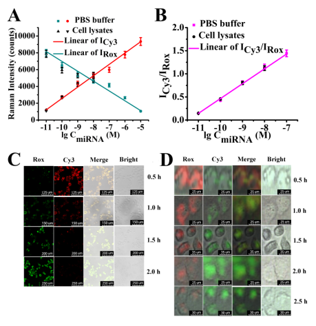 图2. (A) Cy3和Rox的SERS信号值与(B)Cy3与Rox的拉曼信号比值与不同浓度miR-203之间的线性关系;用BSR探针对MCF-7活细胞的(C)荧光和(D)拉曼成像。图片来源:Anal. Chem.2021, 93, 1466−1471