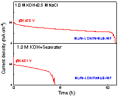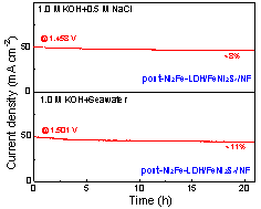 海水约占全球水资源的96.5%,被认为是水电解制氢工程取之不尽的原料。然而海水电解的最大挑战来自Cl-的氧化和及其对催化剂的腐蚀。基于此,本工作先通过控制水热时间对泡沫镍上生长的Ni2Fe-LDH进行部分硫化,制备了镍铁层状双金属氢氧化物/硫化镍铁异质结构(Ni2Fe-LDH/FeNi2S4/NF),该催化剂具有丰富的异质界面、良好的导电性和碱性水氧化催化活性;经2000圈CV活化后,后催化剂post-Ni2Fe-LDH/FeNi2S4/NF表面形成了可以排斥氯离子到达催化剂的活性位点硫酸盐层,使该后催化剂具有优良的耐氯离子腐蚀的性能。因此,在碱性模拟海水溶液中,post-Ni2Fe-LDH/FeNi2S4/NF的析氧催化性能明显优于未活化的催化剂Ni2Fe-LDH/FeNi2S4/NF。当达到100 mA cm−2的电流密度时,前者只需要250 mV的过电位,明显低于后者相应的电位250 mV;前者在达到50 mA cm−2的电位下,计时电流测试20 h后电流密度衰减为8%,在同样条件下,后者运行10 h后电流密度降低约40%。